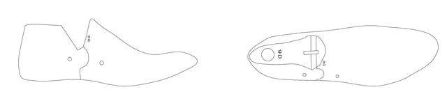 An elongated anatomical last that follows the natural foot shape. Supportive through the arch and suited to welted footwear; fits one size up from US.
